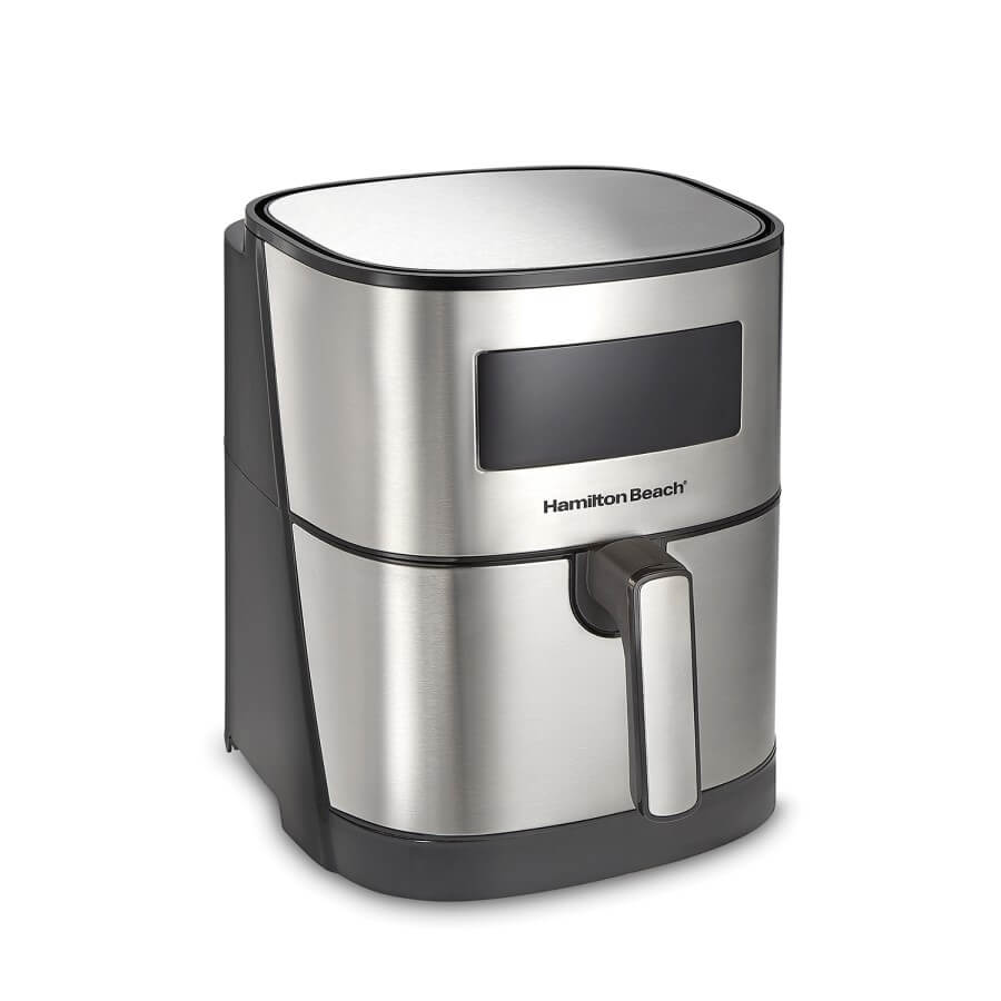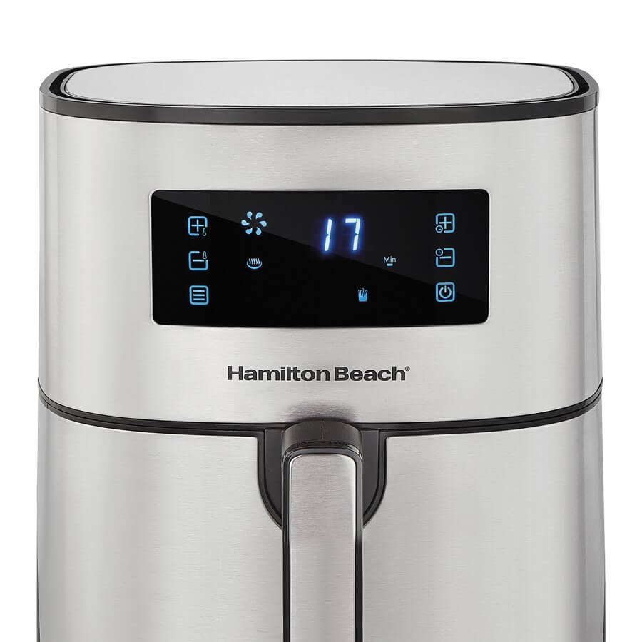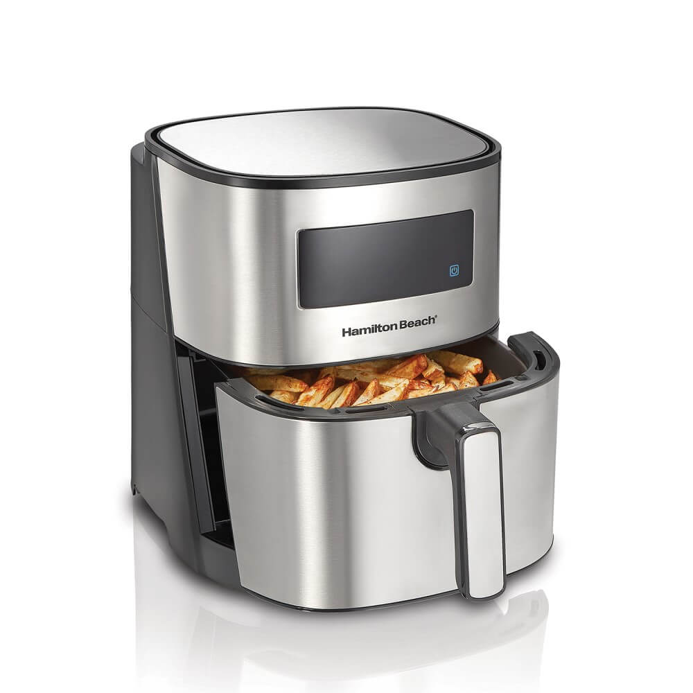 La Freidora HAMILTON BEACH de Gran Capacidad es el aliado ideal para tu cocina. Puedes cocinar, asar, freír o tostar sin necesidad de aceite. 8 funciones preprogramadas: basta un toque para cocinar papas fritas, pollo, mariscos, carne, productos horneados y verduras a la perfección. Capacidad de 5.5 litros para cocinar grandes porciones, cabe hasta un pollo de 2.2 kg, y una potencia de 1700W para mayor eficiencia. Cuenta con temporizador de 60min y apagado automático, además de temperatura ajustable.