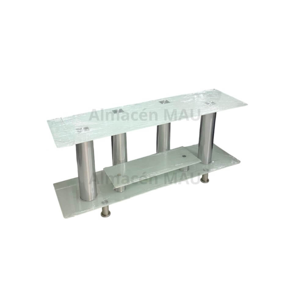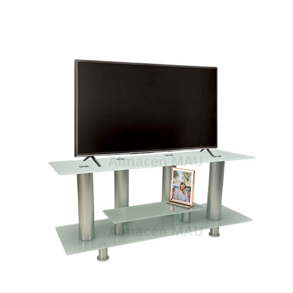 Mesa mueble para Television con capacidad para televisores de hasta 65 pulgadas. Diseño moderno en vidrio templado, múltiples entrepaños y superficies para ubicar objetos.